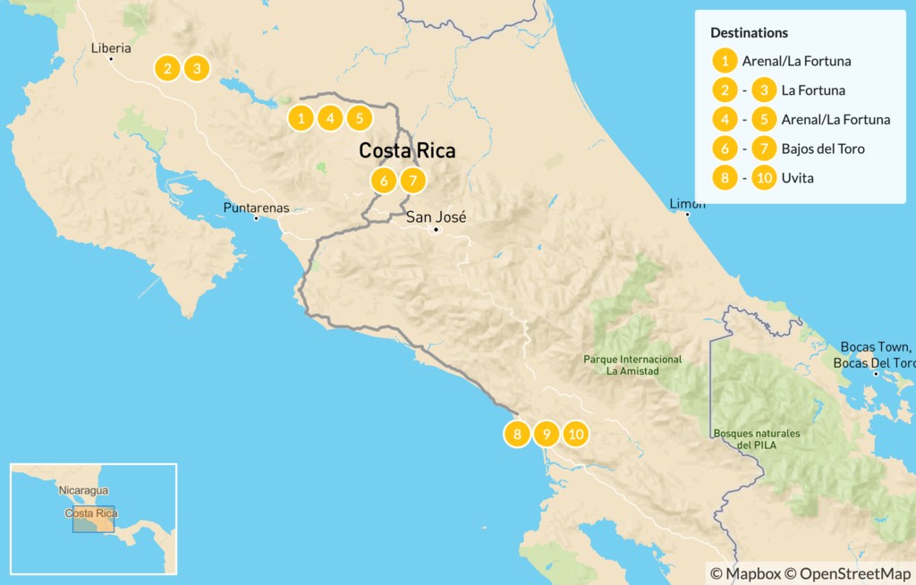 Map of Costa Rica Luxury Wildlife and Adventure Sports Getaway – 11 Days