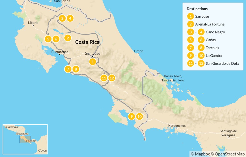 Map of Costa Rica Nature and Birding Adventure – 13 Days