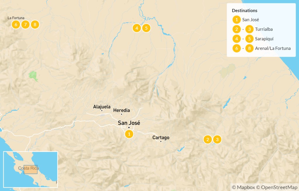 Map of Costa Rica Nature Expedition: Turrialba, Irazú, Sarapiqui, Arenal, & More – 9 Days