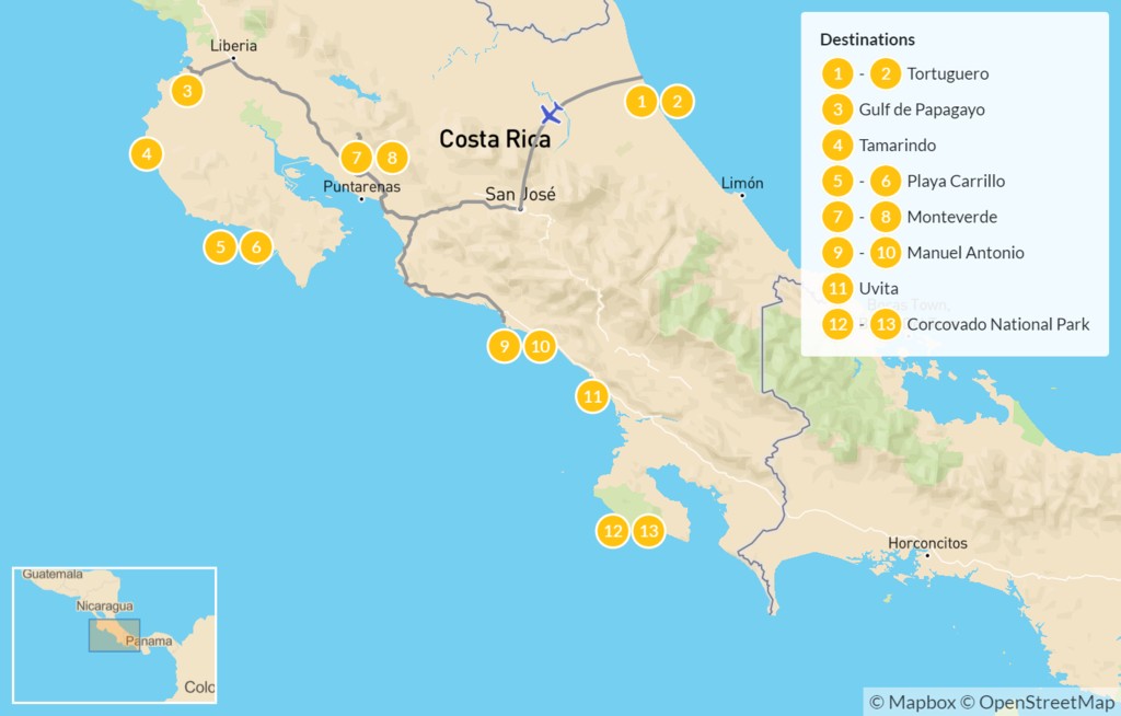 Map of Costa Rica Nature Tour: Tortuguero, Monteverde, Manuel Antonio, & Corcovado – 14 Days