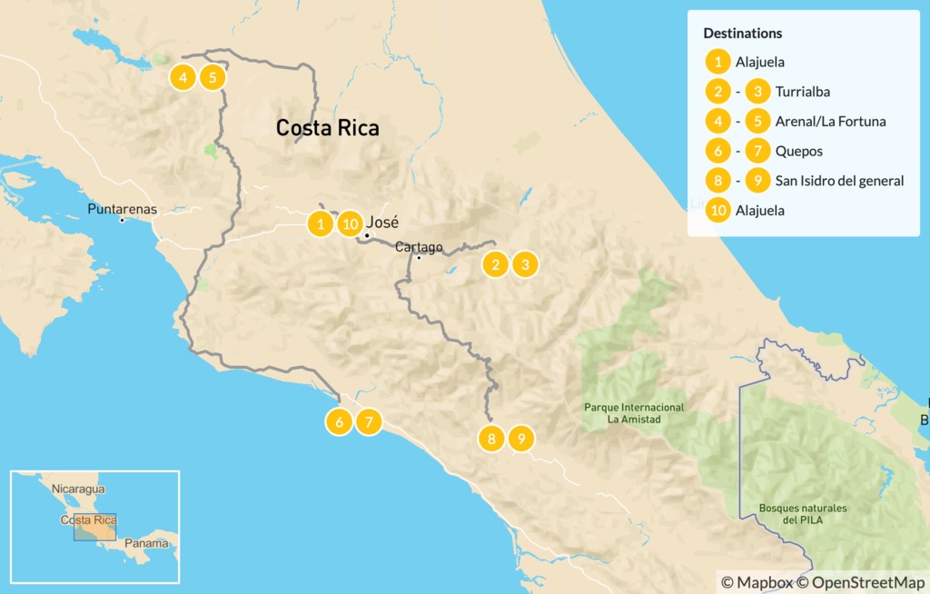Map of Costa Rica Outdoor Adventure and Luxury Wellness – 11 Days