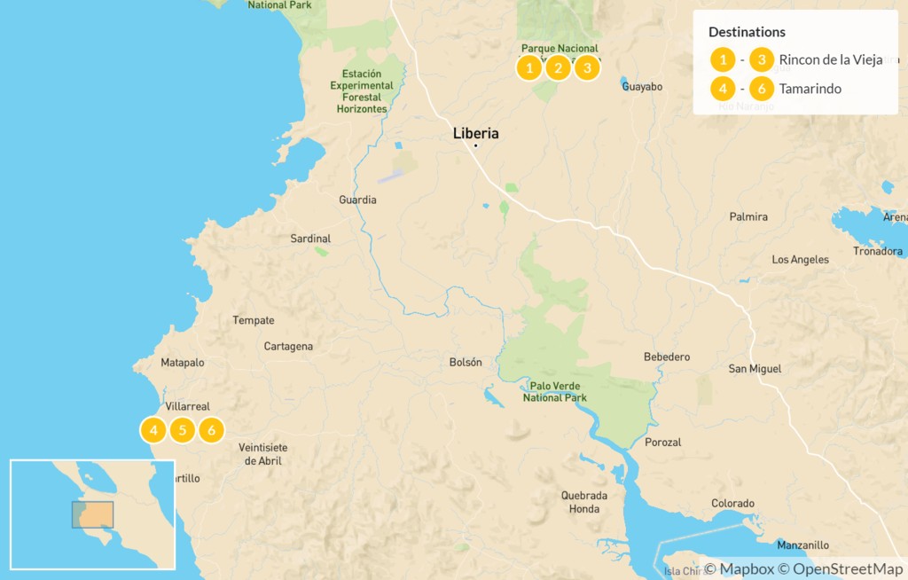 Map of Costa Rica: Rincon de la Vieja to Tamarindo Beach – 7 Days