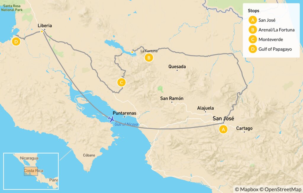 Map of Costa Rica Road Trip: Volcanoes, Cloud Forests & Pacific Beaches – 9 Days