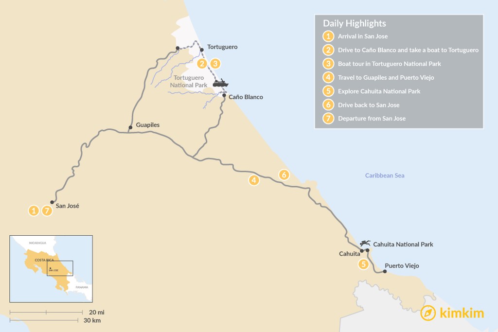 Map of Costa Rica’s Caribbean Coast: Tortuguero & Puerto Viejo – 7 Days