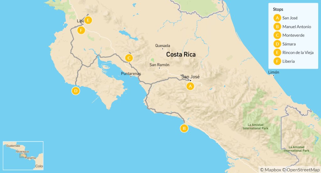 Map of Costa Rica’s Mountains, Waterfalls, Wildlife & Beaches for Families – 14 Days