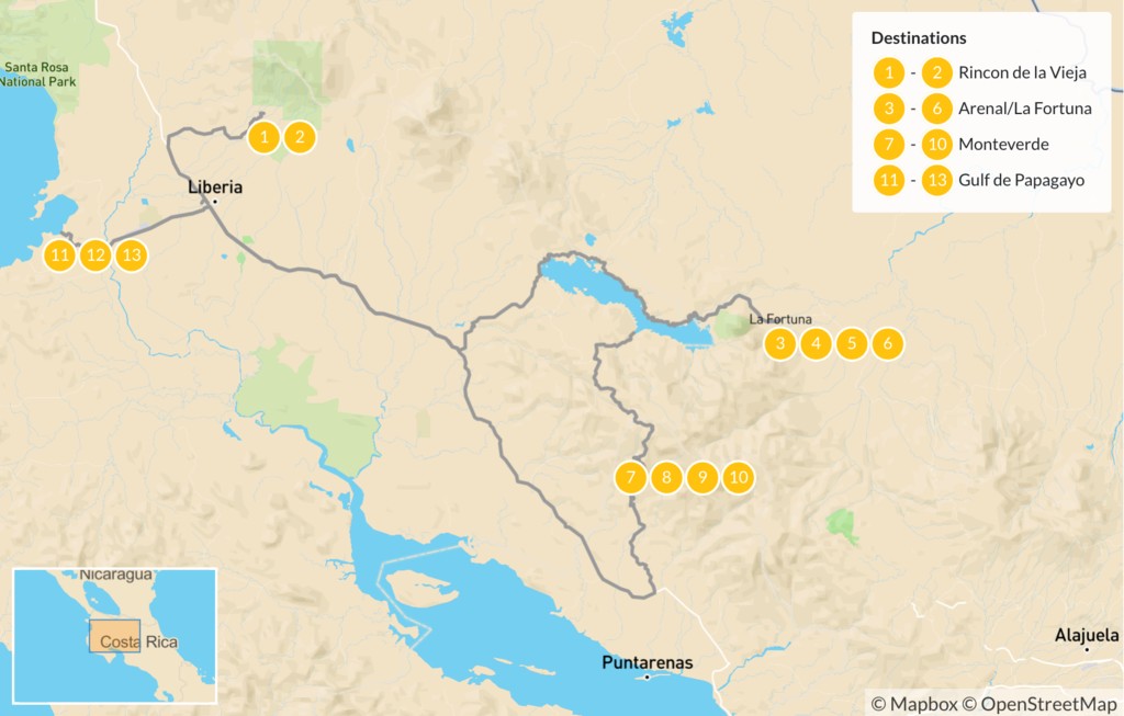 Map of Costa Rica’s Volcanoes, Cloud Forests & Golden Coast – 14 Days