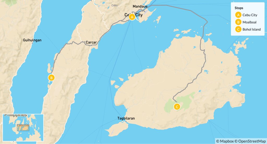Map of Countryside Adventures in the Philippines: Cebu City, Moalboal & Bohol Island – 7 Days