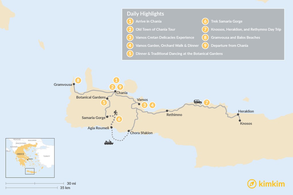 Experience the romance of Crete—Greece’s largest island—with this 9-day itinerary. You’ll use the coastal city of Chania, with its medieval architecture and postcard-perfect Venetian port as your base of exploration. Check out local markets, visit a traditional village, and enjoy a Cretan feast with after-dinner dancing. Then, hike the Samaria Gorge before wrapping up with relaxation on pink-sand beaches.