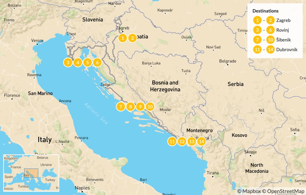 Map of Croatia Family Vacation: Zagreb, Rovinj, Šibenik, & Dubrovnik – 15 Days