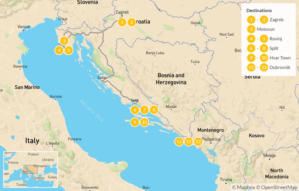 Map of Croatia Family Vacation: Zagreb, Rovinj, Split, Hvar, & Dubrovnik – 13 Days