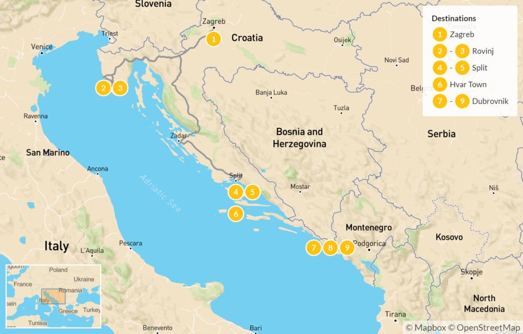 Map of Croatia Family Vacation: Zagreb, Rovinj, Split, Hvar, & Dubrovnik – 9 Days