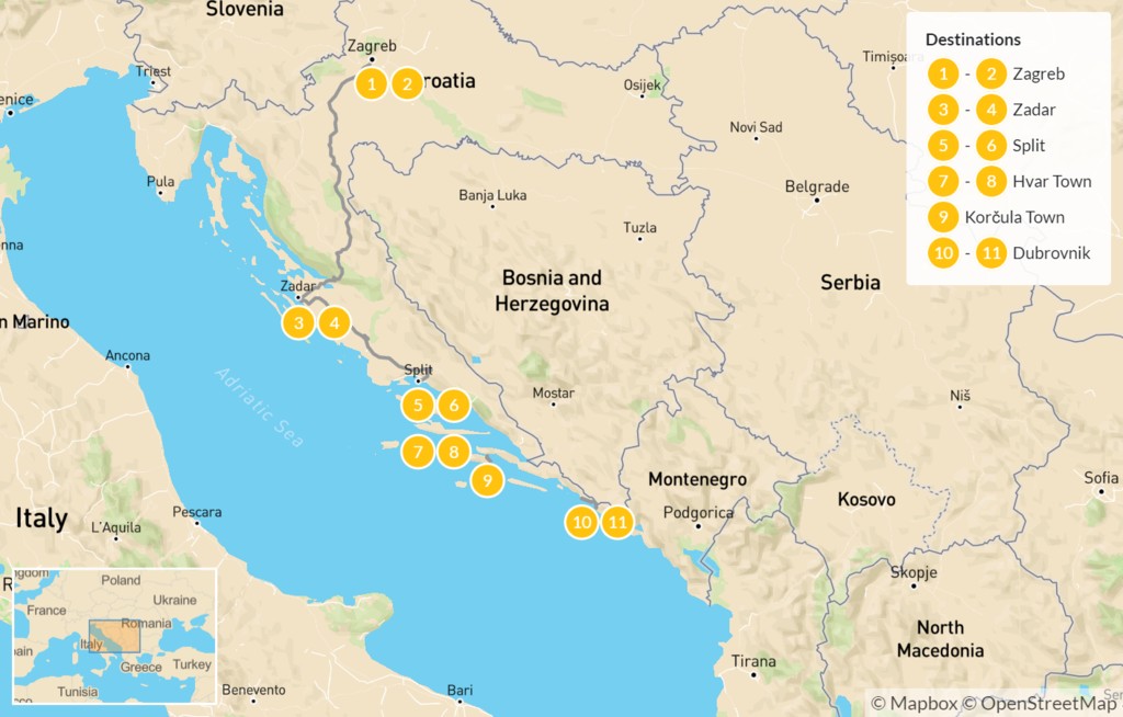 Map of Croatia Luxury Tour: Zagreb, Zadar, Split, & Dubrovnik – 12 Days