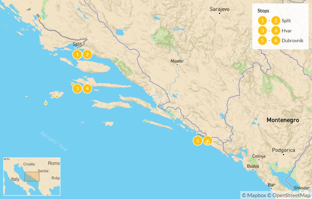 Map of Croatia’s Dalmatian Highlights Tour: Split, Hvar & Dubrovnik – 7 Days