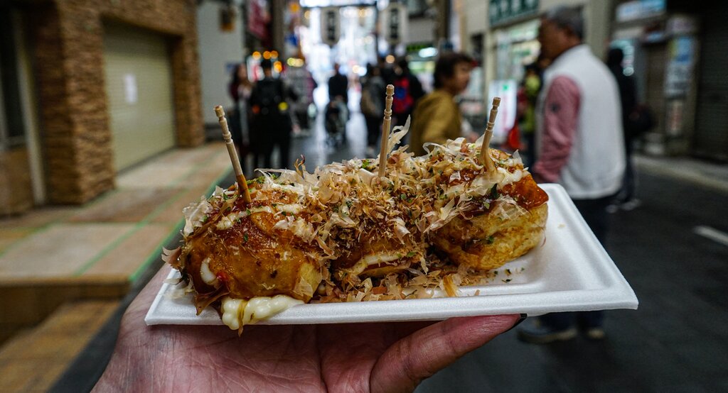 By now, you’ll probably be ready to refuel, so you’ll head to your final stop, the bustling Kuromon Market. Under the shelter of a covered arcade, walk through the lively market’s shops and food stalls, surrounded by the enticing aromas of savory and sweet dishes. Sample everything from succulent Wagyu beef and fresh seafood to Michelin-rated takoyaki, a popular Japanese street food featuring ball-shaped octopus bites. Chat with friendly vendors and more about local food culture as your guide regales you with stories about the market’s significance in Osaka’s culinary scene.