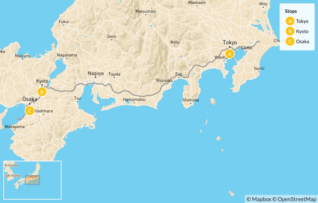 Map of Culinary Excursion Through Japan: Tokyo, Kyoto & Osaka – 7 Days