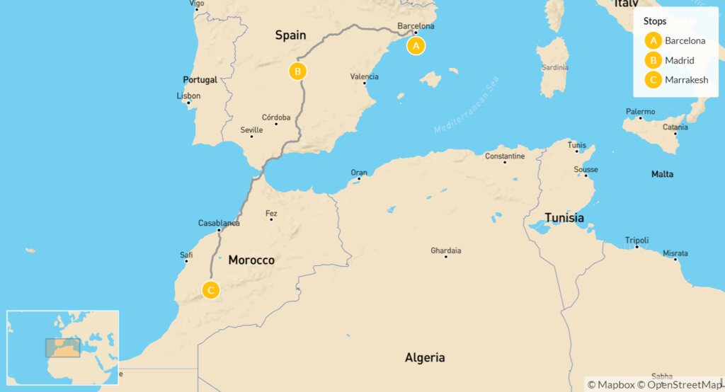Map of Culinary Tour of Spain & Morocco: Barcelona, Madrid & Marrakesh – 10 Days