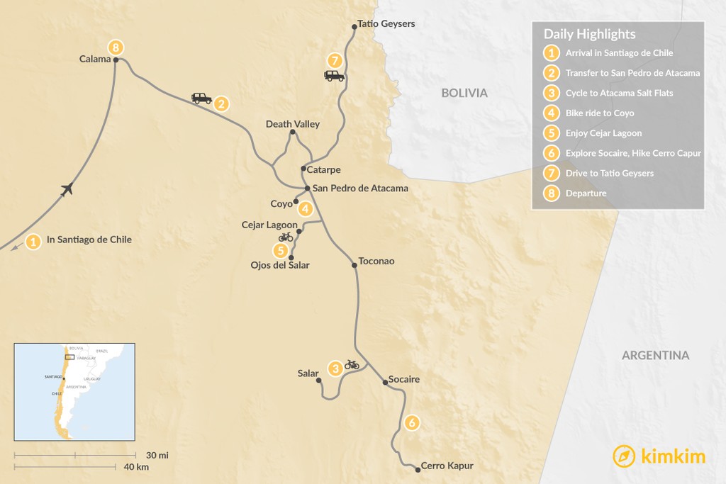 Map of Cultural Bike & Hike Trip at Atacama Desert – 8 Days