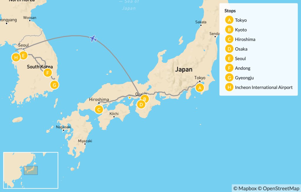 Map of Cultural Experiences & Historic Highlights in Japan & South Korea – 14 Days