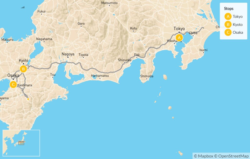 Map of Cultural Highlights & Modern Fun in Tokyo, Kyoto & Osaka – 12 Days