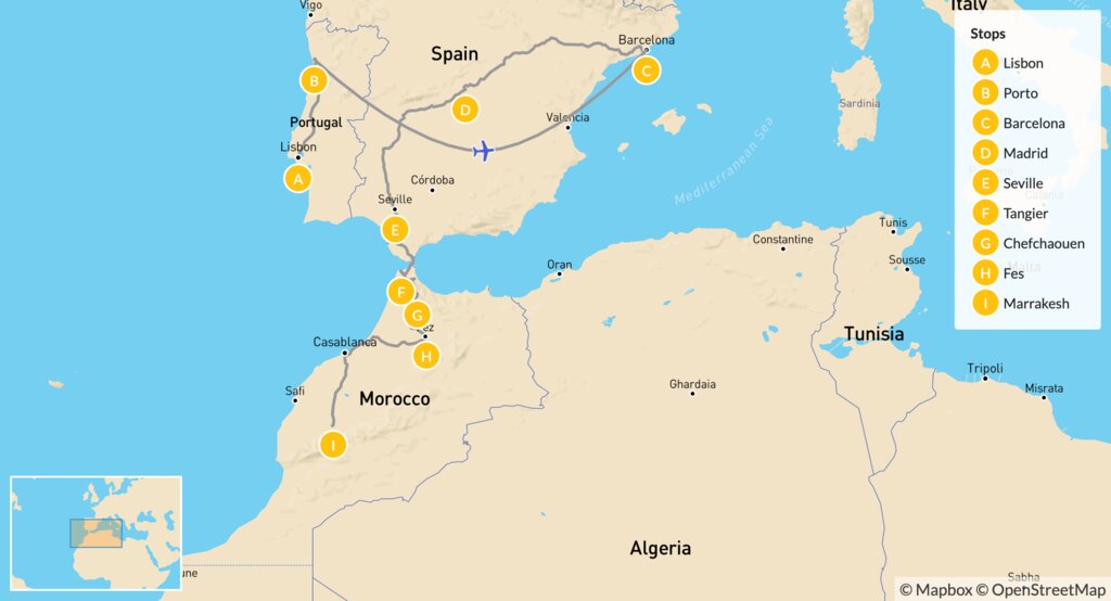 Map of Cultural Highlights of Portugal, Spain & Morocco – 21 Days
