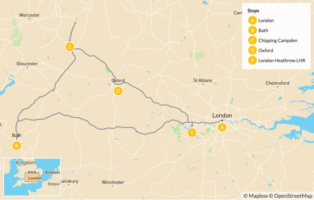 Map of Cultural & Literary Tour of Bath, the Cotswolds & Oxford – 7 Days