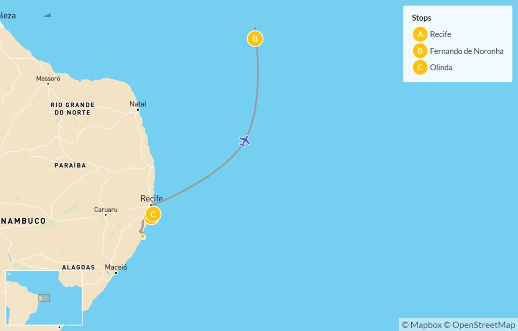 Map of Cultural & Natural Wonders of Recife, Olinda & Fernando de Noronha – 13 Days