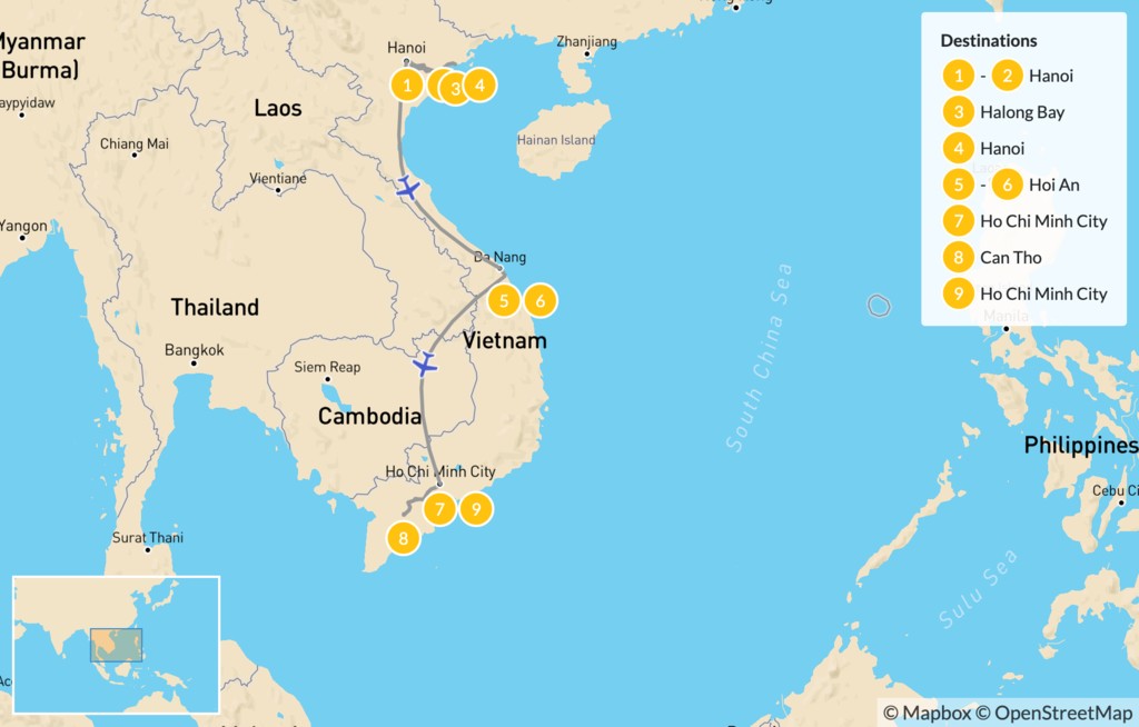 Map of Cultural Tour of Vietnam: Hanoi, Ha Long Bay, Hoi An & More – 10 Days