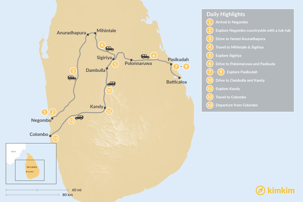 Map of Cultural Triangle and the East Coast of Sri Lanka – 13 Days
