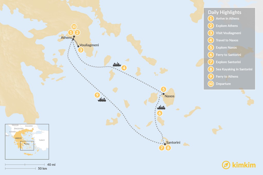 Map of Culture & Adventure in Athens, Naxos & Santorini – 10 Days