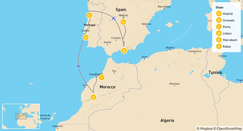 Map of Culture & Adventure in Spain, Portugal & Morocco – 14 Days