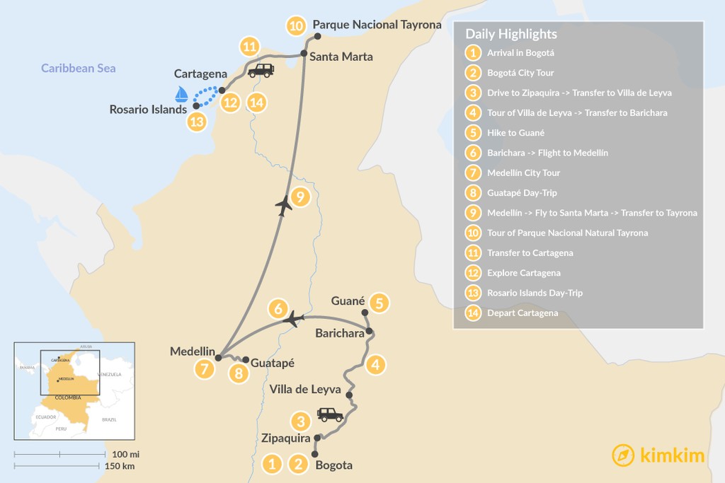 Map of Culture and Nature in Colombia: Cities, Landscapes, & Colonial Villages – 13 Days
