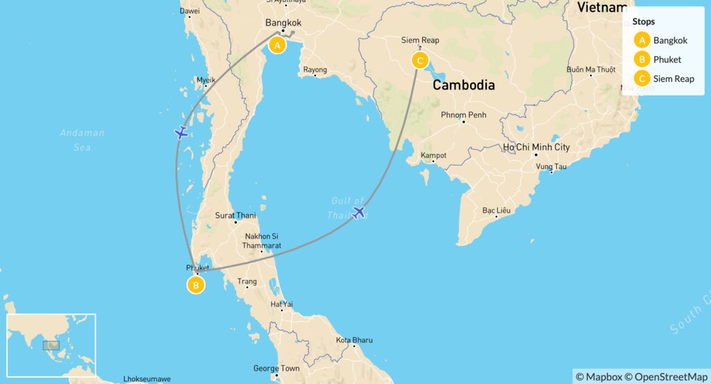Map of Culture & Beaches in Southeast Asia: Bangkok, Phuket & Siem Reap – 10 Days