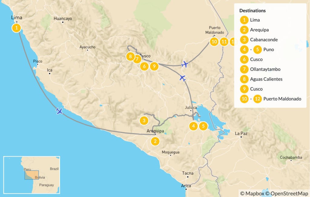 Map of Culture & Nature in Peru: Colca Canyon, Machu Picchu, Sacred Valley, Lake Titicaca – 14 Days