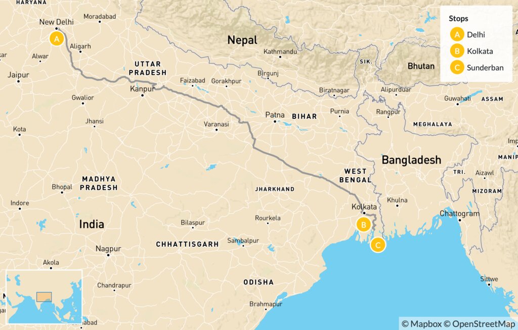 Map of Culture & Wildlife in Northern India: Kolkata, Sundarbans & Delhi – 8 Days