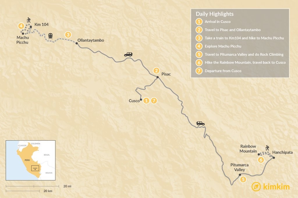 This trek culminates in the visit to Machu Picchu, the jewel in the crown of the Andes Mountain Range. Then onto Pitumarca for rock climbing in this beautiful valley, followed by a stunning day hike to Mount Vinicunca (Rainbow Mountain).
