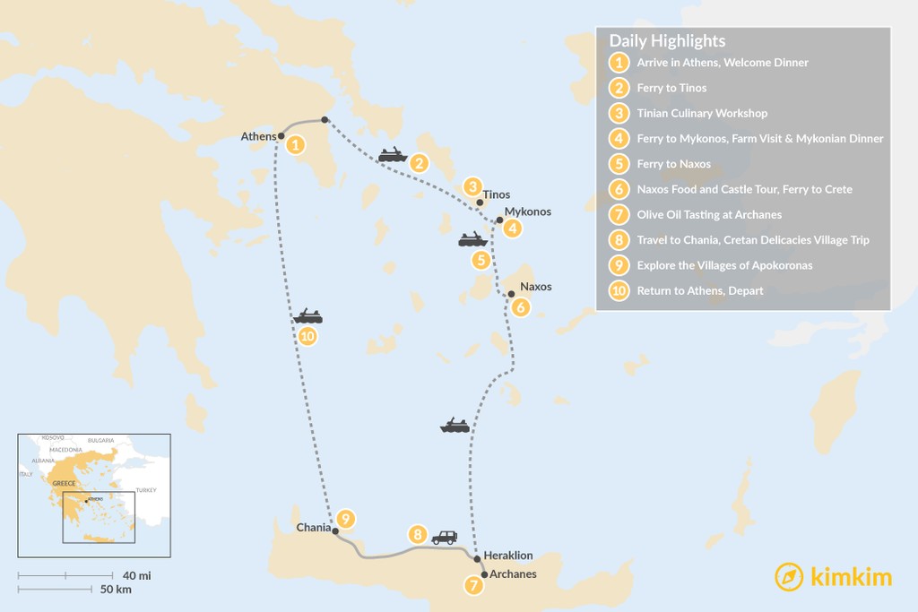 Map of Cyclades & Crete Culinary History Tour – 10 Days