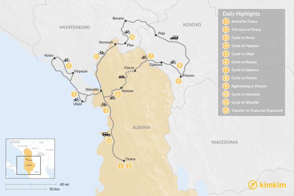 Map of Cycle Tour of Montenegro, Kosovo & North Albania – 12 Days