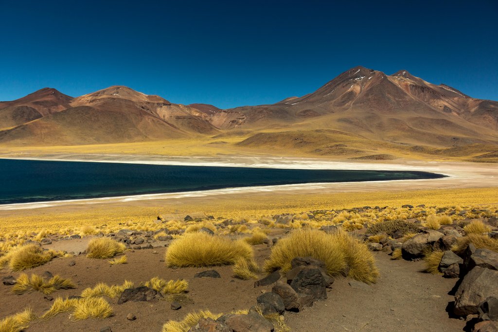 During the journey between these two places, you will see some of the most evocative and ancient landscapes anywhere in the world. This high-altitude desert abounds with seemingly endless salt flats, painted hills that change color depending on the light, towering Andean peaks, and the volcanic Domeyko Cordillera, where flaming red mountains create the base of the Valley of the Moon.