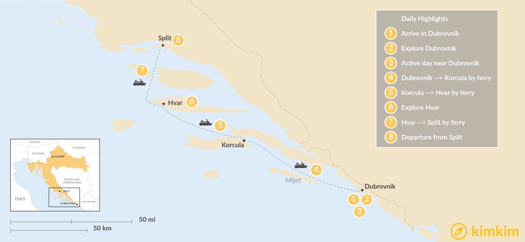 Map of Dalmatia Adventure: Dubrovnik, Korčula, Hvar, & Split – 8 Days
