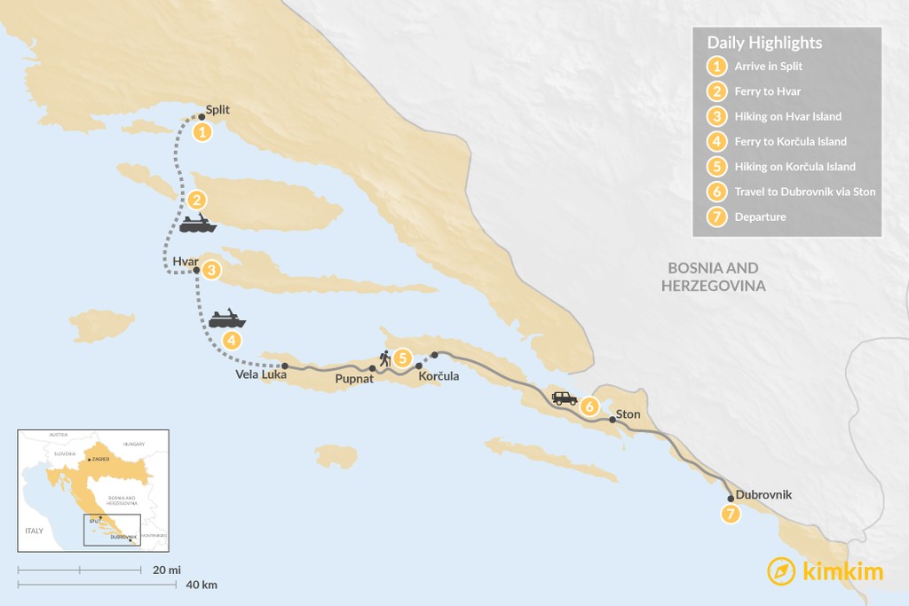 Map of Dalmatia Adventure: Split, Hvar, Korčula & Dubrovnik – 7 Days