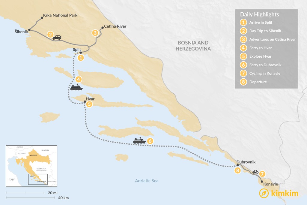 Map of Dalmatia Adventure: Split, Krka, Hvar & Dubrovnik – 8 Days