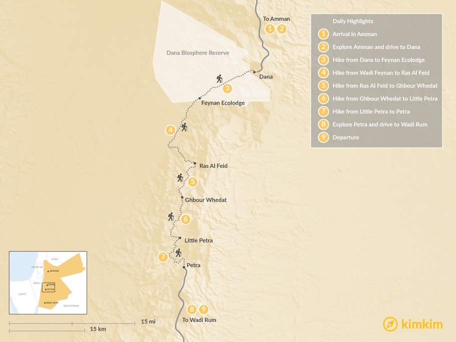 The epic trek from Dana to Petra, rated one of the world’s best hikes by National Geographic, takes you through many of Jordan’s distinct landscapes and major archeological sites. It’s part of the national Jordan Trail, which runs the length of the country from north to south. Read on for a detailed description of the 9-day trekking itinerary.
