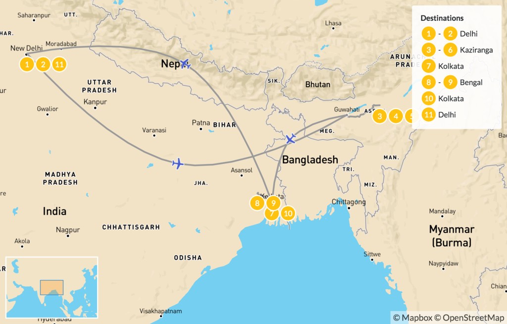 Map of Delhi & Kolkata Wildlife Tour – 11 Days