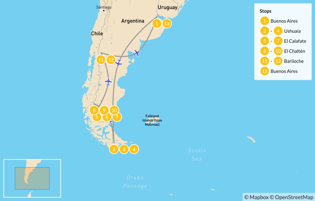 Map of Deluxe Active Patagonia: Buenos Aires, Tiera del Fuego, El Calafate, El Chalten & the Andes Trail – 14 Days