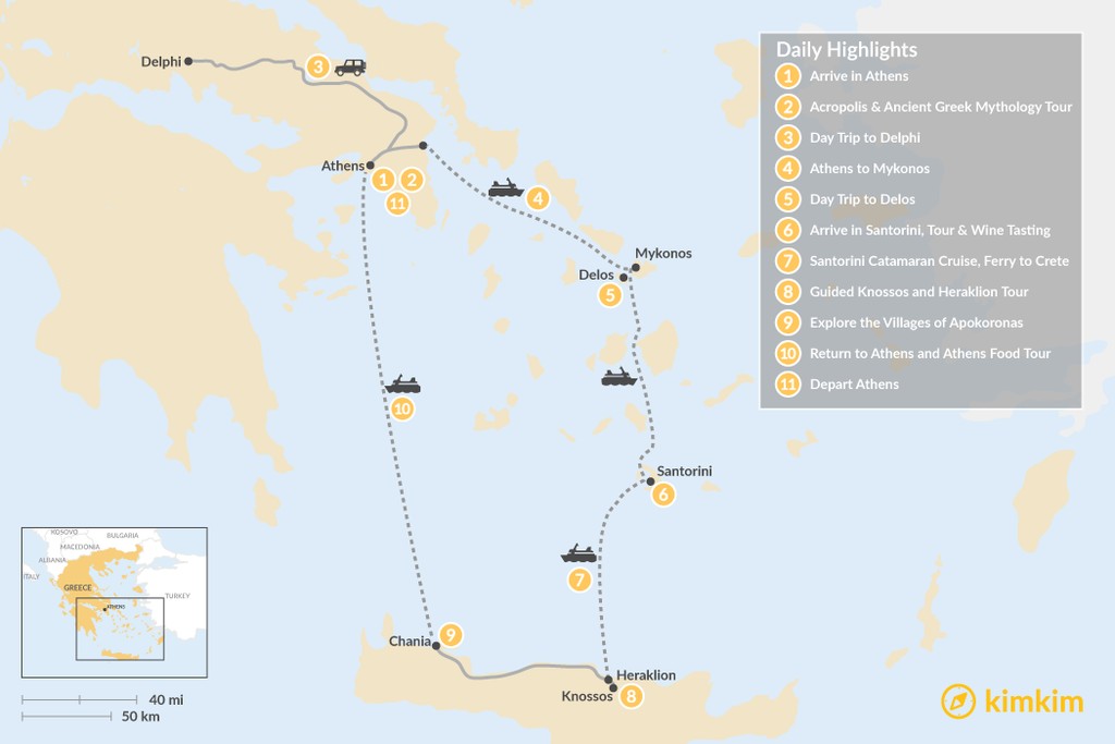 Map of Discover Athens, Mykonos, Santorini & Crete – 11 Days