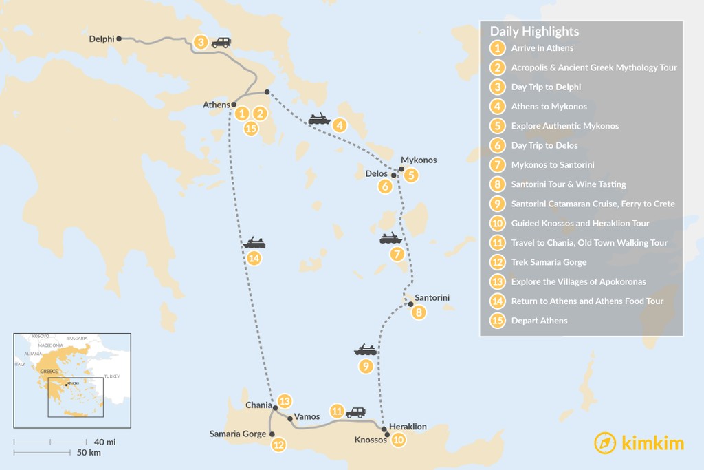 Map of Discover Athens, Mykonos, Santorini & Crete – 15 Days
