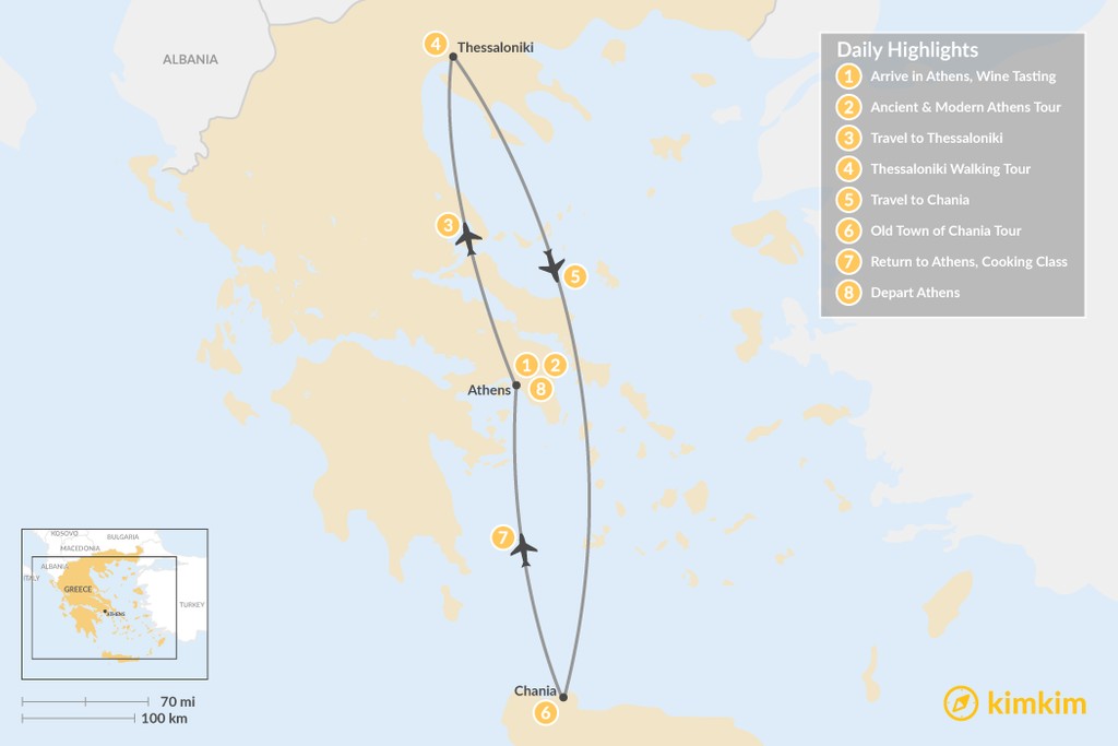 Get a healthy dose of history and culture on this 8-day tour of Greece’s biggest cities and the island of Crete. Begin with a few days in the capital, where you’ll visit the Acropolis and explore Athens’ more modern neighborhoods and markets. Next, you’ll head to Thessaloniki where you’ll find a castle and beautiful Byzantine churches among its many gems. Finally, set out for Crete to stroll around the picturesque Old Town of Chania before making your way back to Athens for a farewell dinner with an unforgettable view.