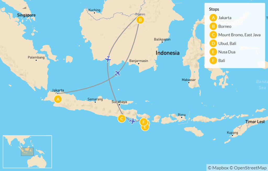 Map of Discover Borneo’s Rainforest, Java’s Volcanoes & Bali’s Beaches – 12 Days