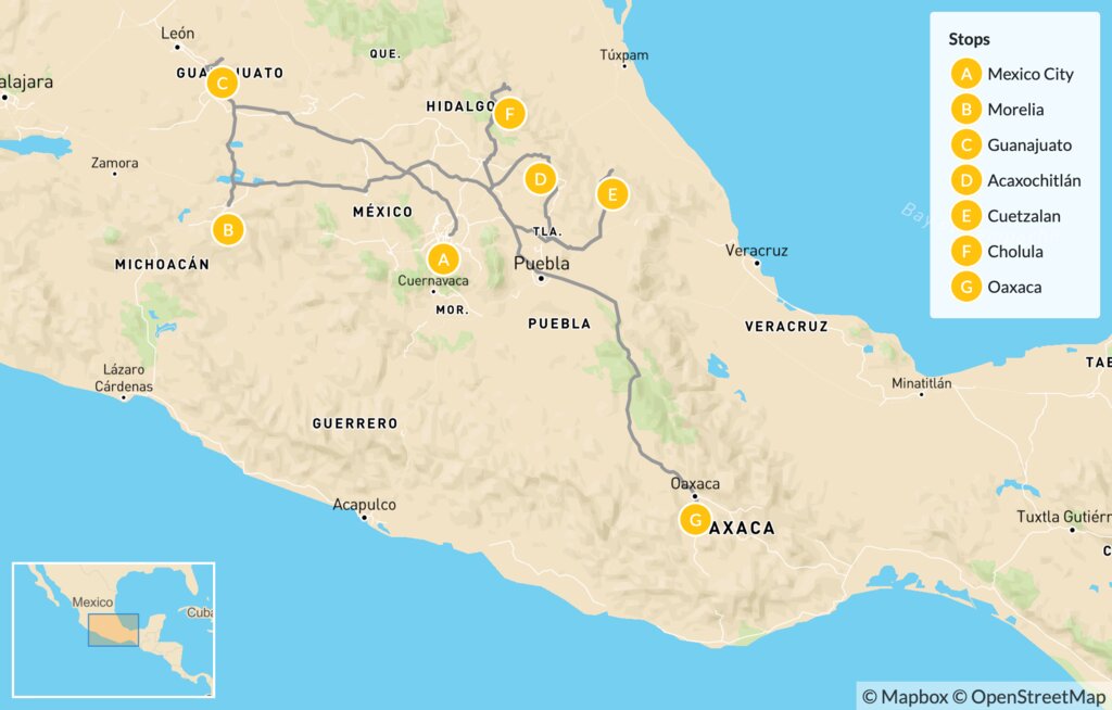 Map of Discover Central Mexico: Morelia, Guanajuato, Acaxochitlán, Cuetzala, Cholula & Oaxaca – 12 Days