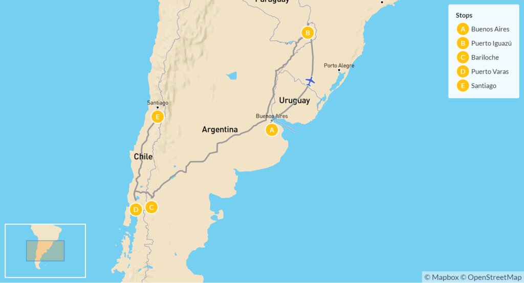 Map of Discover Cities, Waterfalls & Lakes in Argentina & Chile – 14 Days